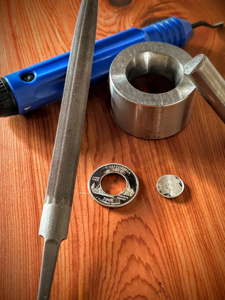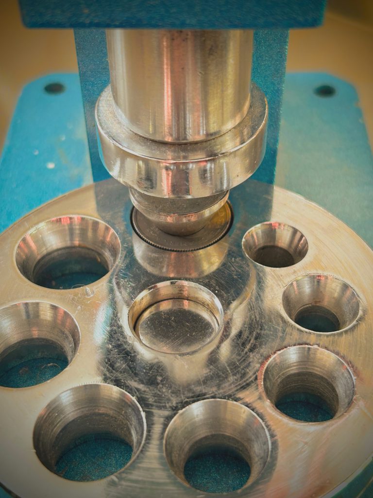 The first step in the process is to create an opening in the center of the coin. This is done using a punch press, which ensures a clean and precise hole. The size of the hole depends on the final ring size and the type of coin being used. This step, although simple, is one of the most important parts as it is critical in setting the the foundation for shaping the ring while preserving the coin’s original design elements on the outer band.