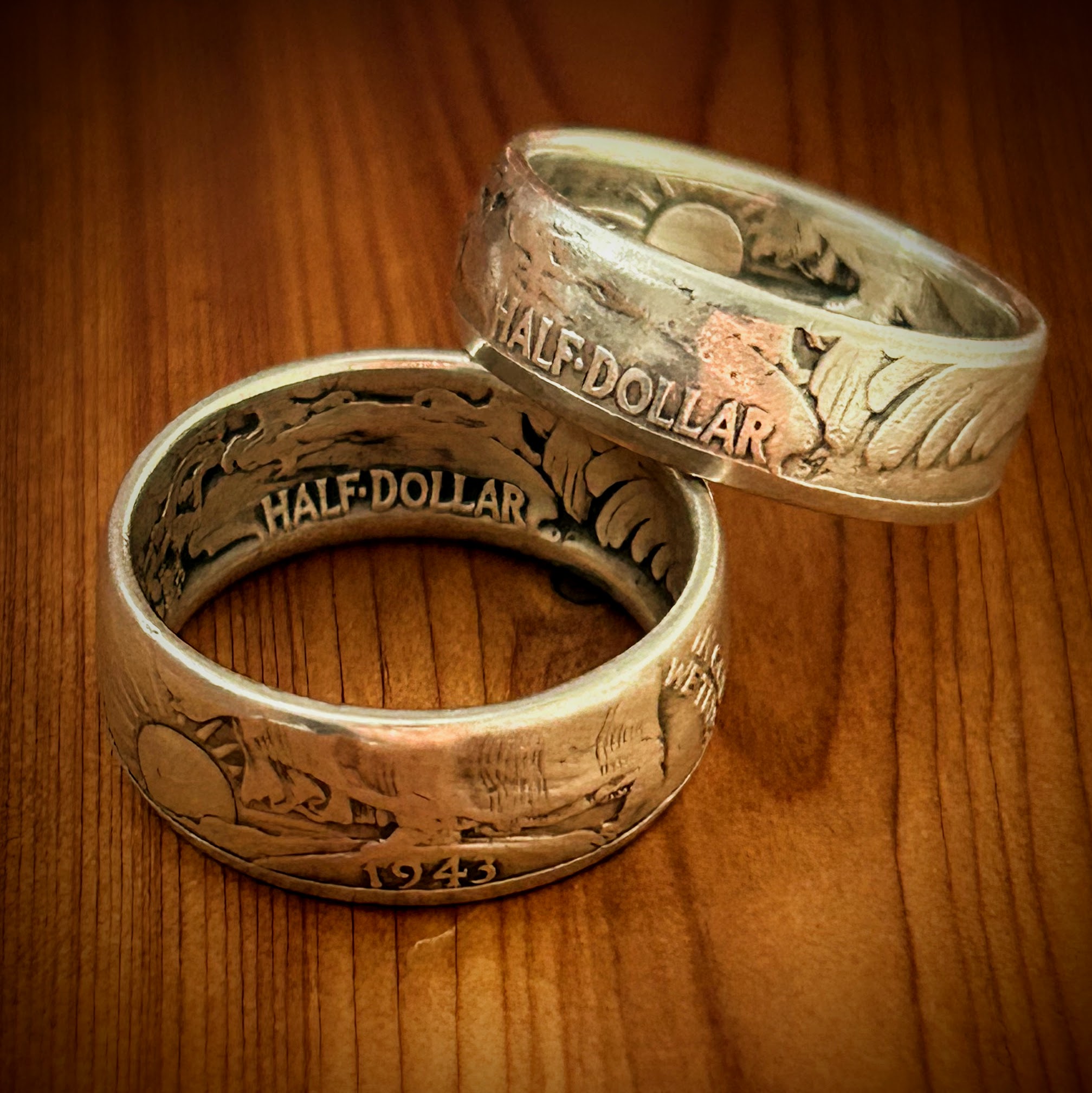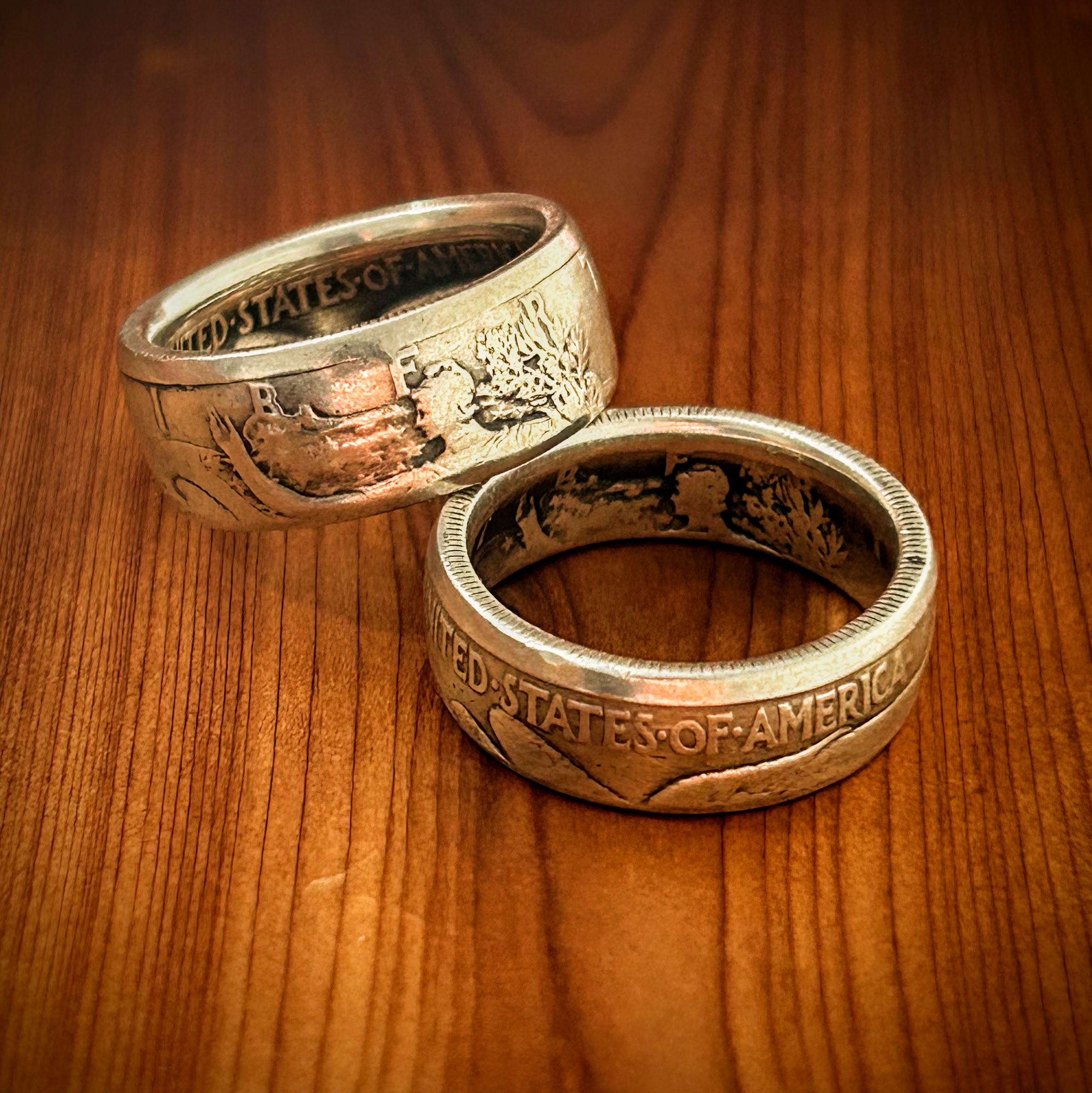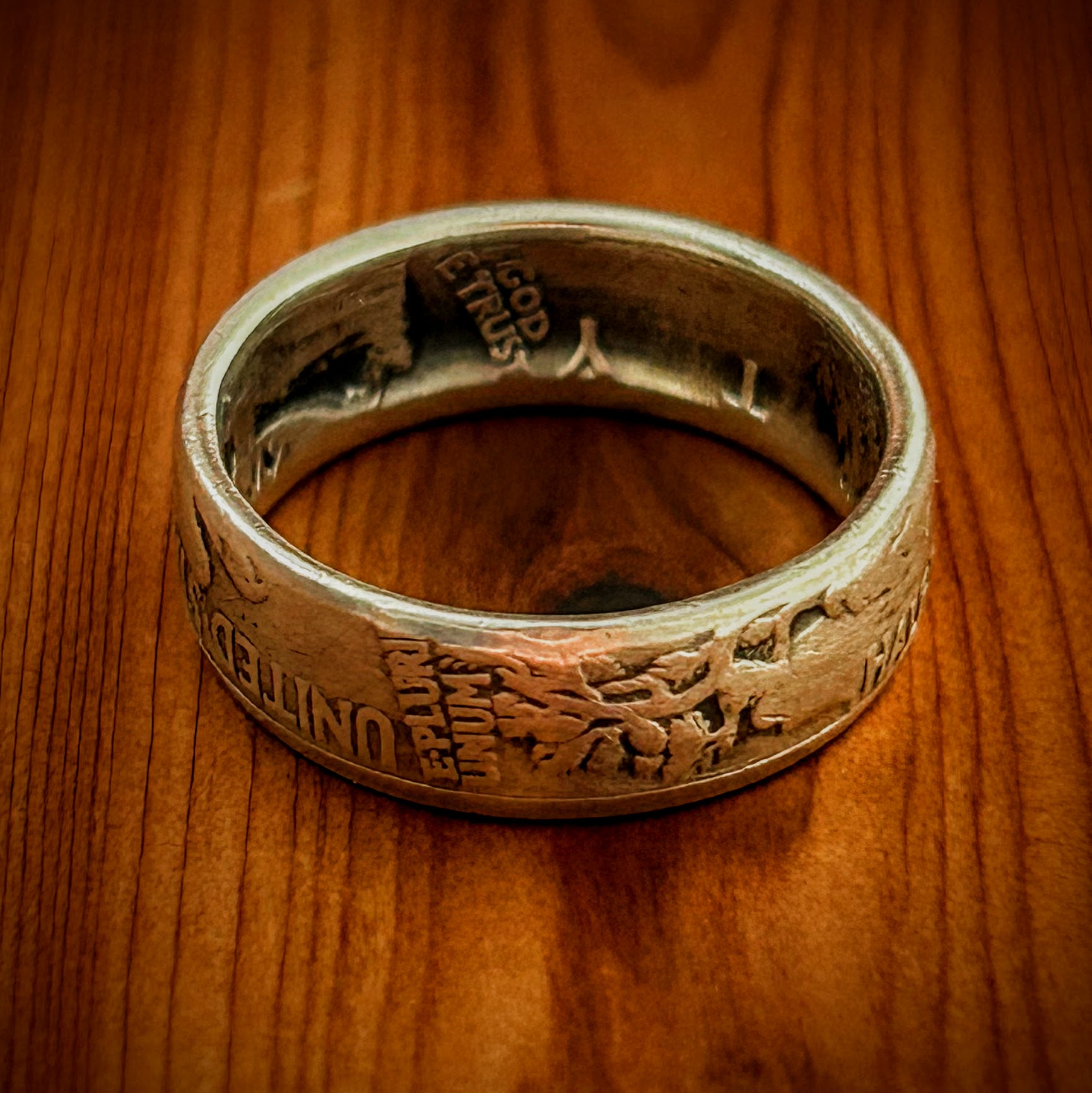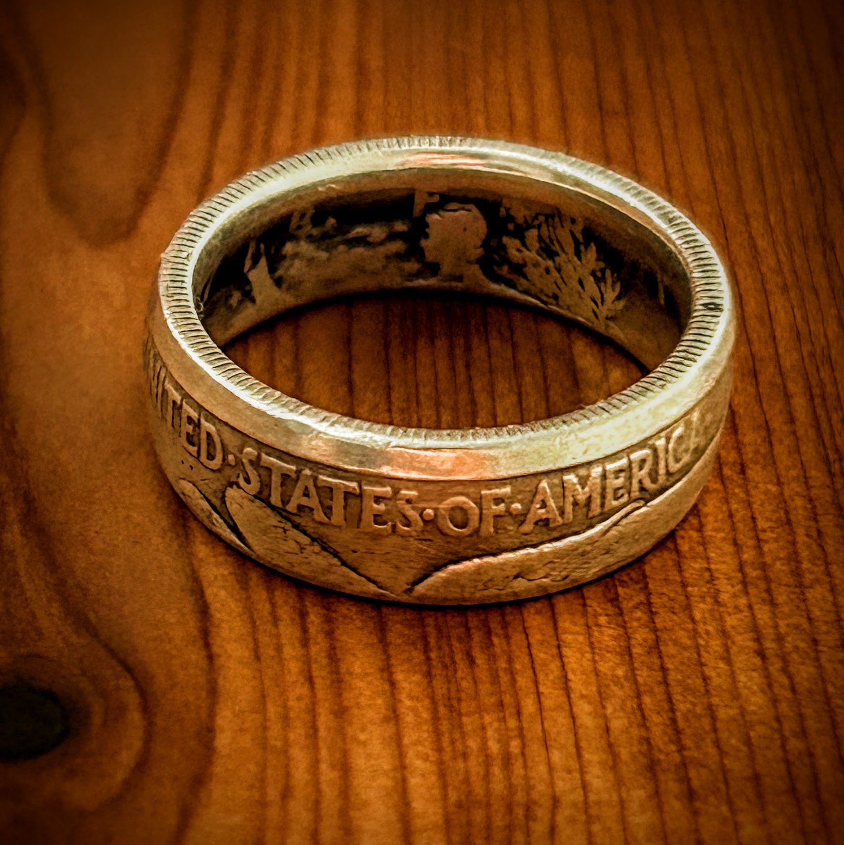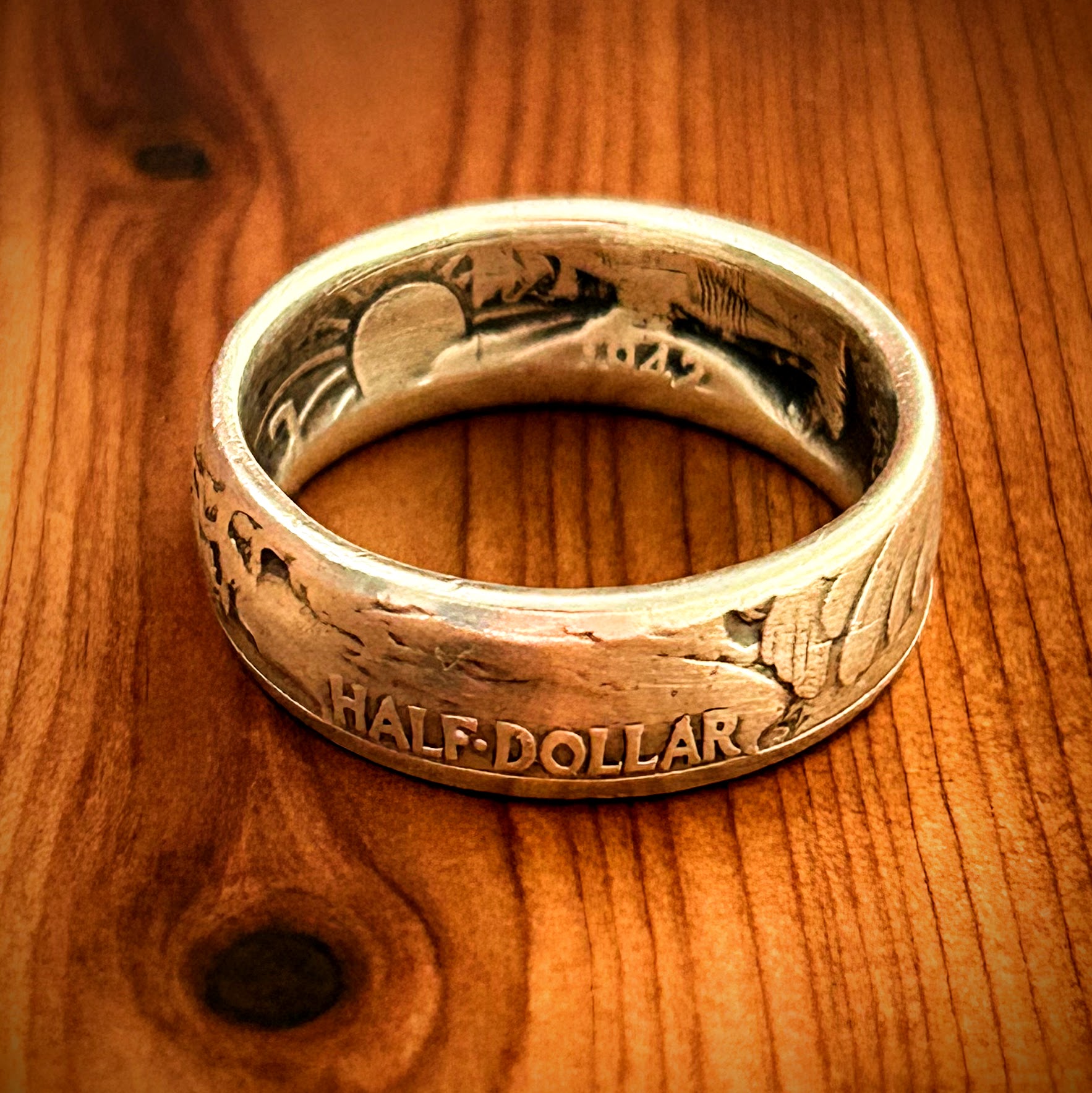 Handcrafted from an authentic Walking Liberty Half Dollar, this stunning silver ring captures the beauty and symbolism of one of America’s most beloved coin designs. The words “United States of America” are prominently displayed, making a bold statement of independence and strength.